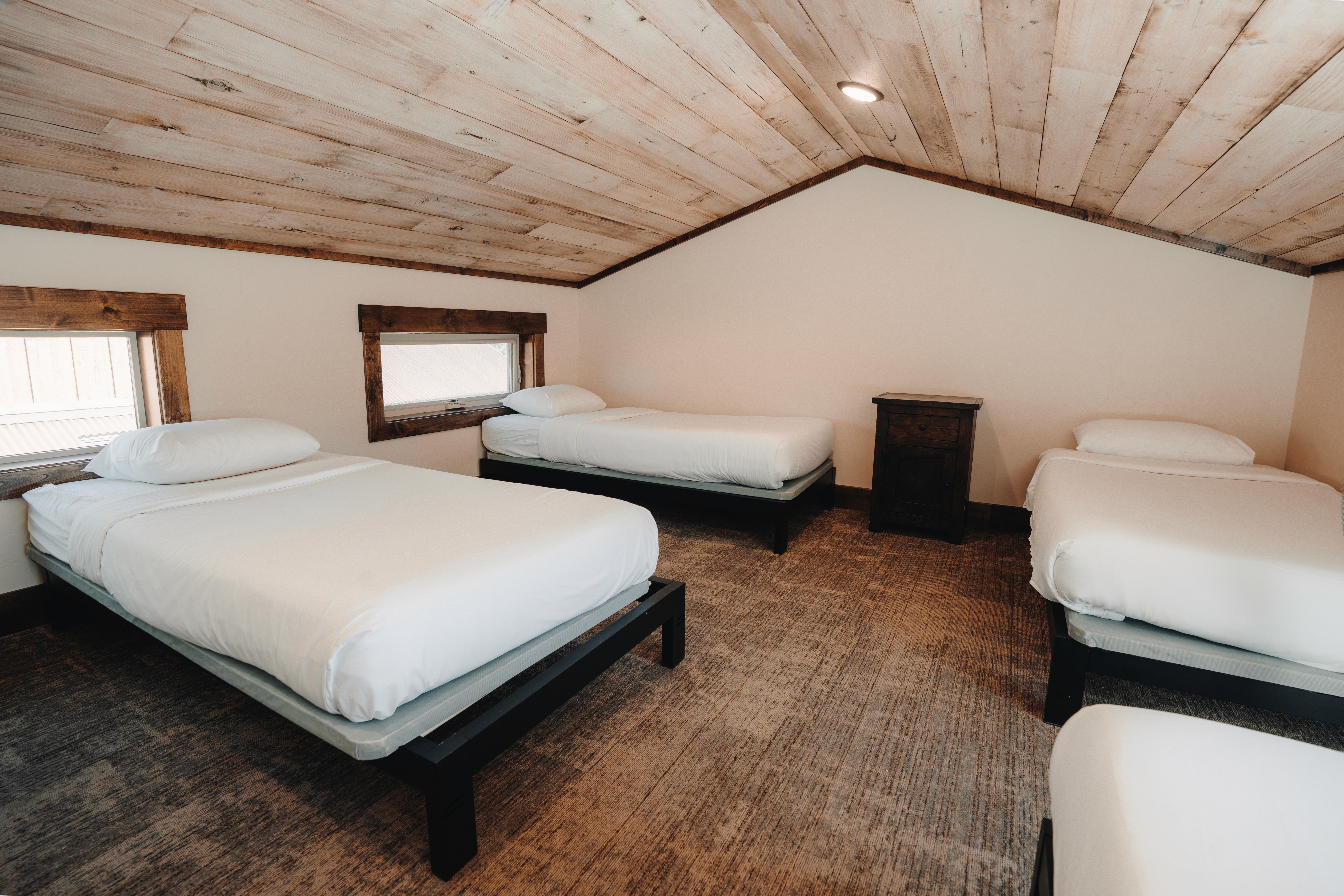 The Teton Signature Lodge has a private bedroom with a queen bed and a pull-out sofa in the living area. In the loft, accessible only by a ladder, there are four twin beds. Please refer to our photos, the ladder is steep and may not be suitable for very young children. Inside the cabin is a living room with a gas fireplace, a snack bar with stools, and a full kitchen. The kitchen includes a dishwasher, microwave, full oven with 4-burner electric cooktop, a full refrigerator/freezer, toaster, silverware, dishes, glassware, pots & pans, and kitchen utensils. A private bathroom with a combined shower/bath is also located inside the cabin. Cabins